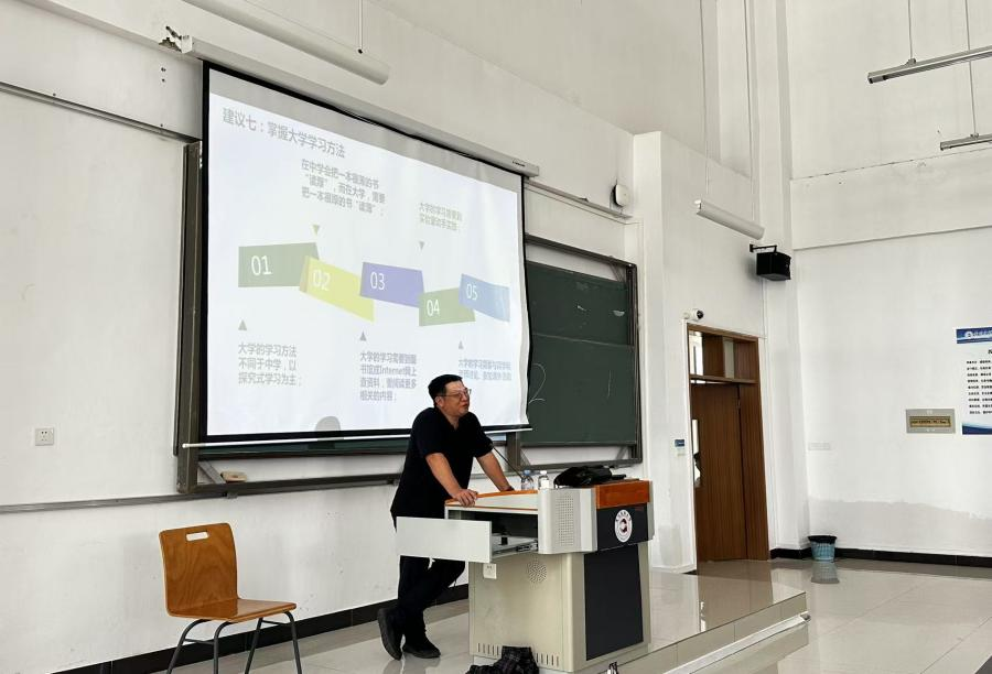党委副书记、院长王林均为同学们分享学习方法。他提到:“在中学,要学会把一本很薄的书‘读厚’;而在大学,要学会把一本很厚的书‘读薄’。”他建议新生先确定长远目标,再将其拆解为短期小目标,让学习更有方向;同时鼓励大家面对困难时保持乐观,以持久战的心态坚持学习。